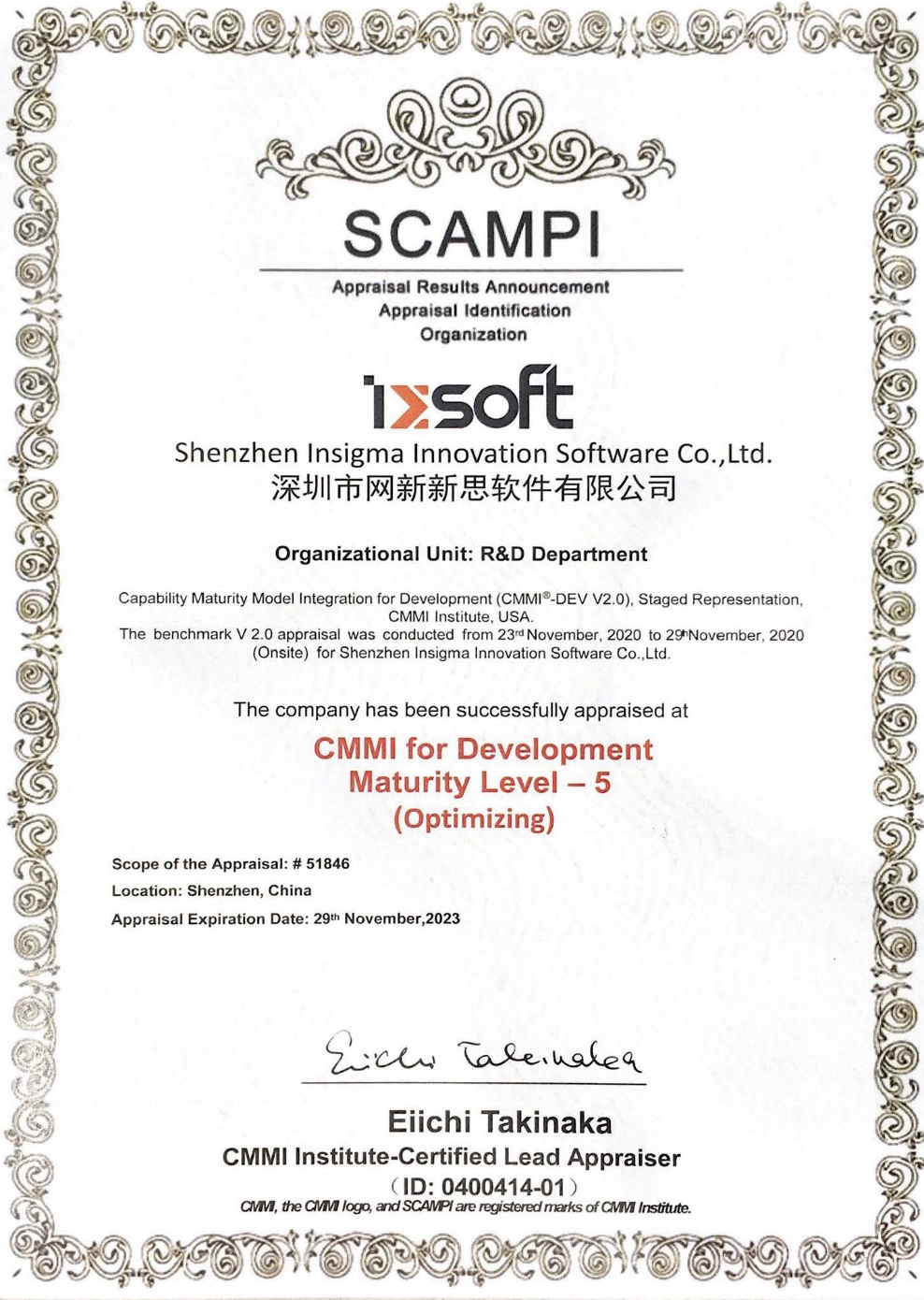 本次由SEI授权的日本主任评估师Eiichi Takinaka及其带领的CMMI评估小组,对公司进行了为期8天的CMMI 5级正式评估。评估小组经过严谨专业的评估,对公司的软件过程管理体系及其应用情况进行了全面、严谨的审查,通过多轮访谈,查阅项目文档等方式,对公司软件的整体成熟度进行对比分析,经过评估小组在完成对应的证据确认后,一致认为公司的过程完全满足CMMI-DEV V2.0 ML5对应的目标与实践要求,最终宣布深圳新思正式通过CMMI-DEV V2.0五级评估!
