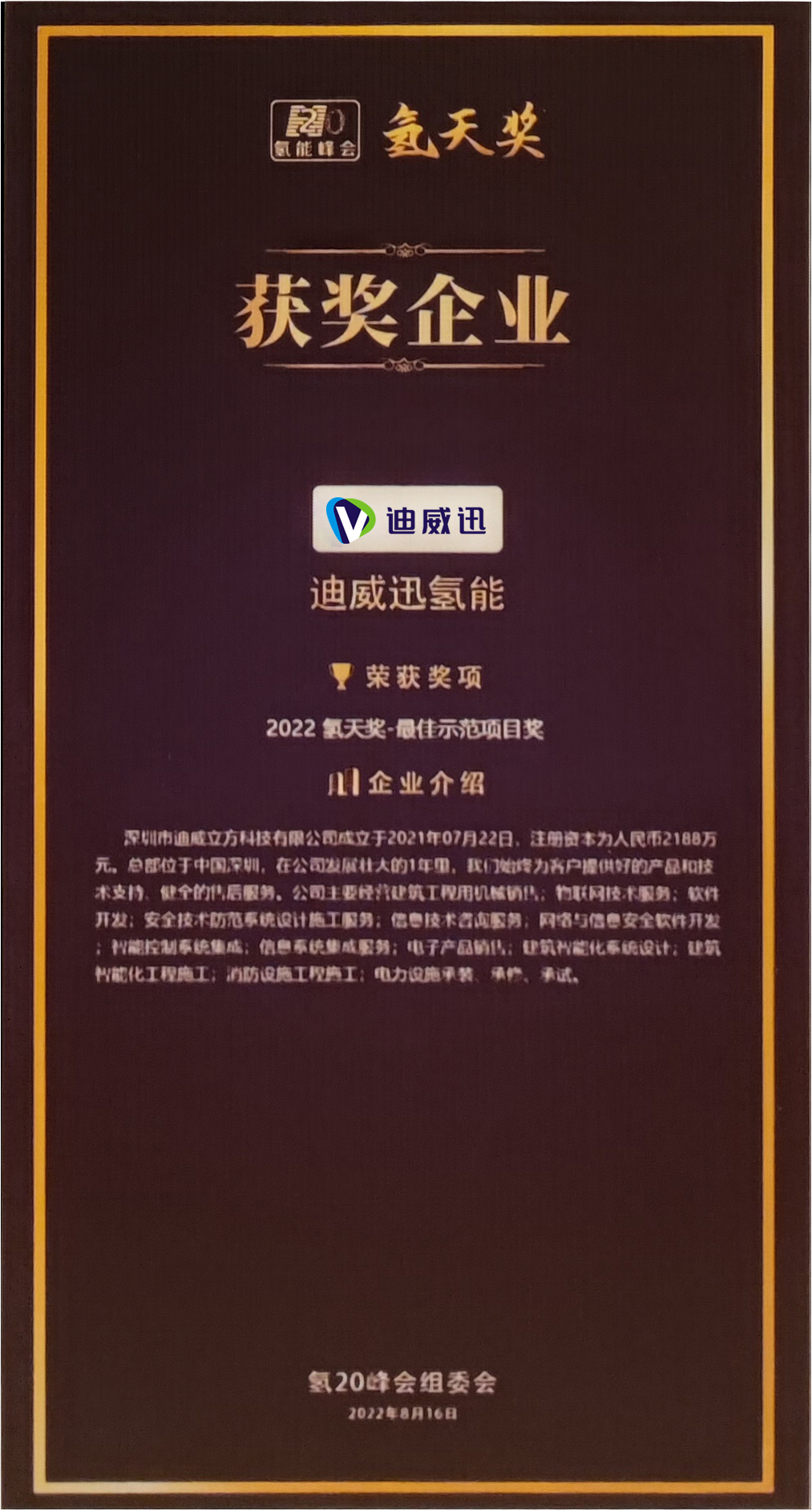 2022年8月16日,氢20峰会氢天奖在深圳市福田会展中心举办颁奖典礼,TapTap点点氢能项目荣获企业奖最佳示范奖。